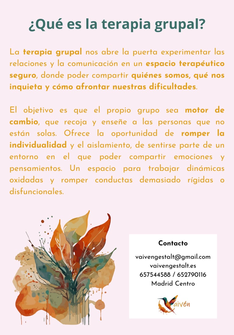 Aquí entra la terapia grupal, en la que como terapeutas nos introducimos como figura reguladora que canaliza y sostiene aquellas dificultades o conflictos no resueltos. La terapia pretende averiguar donde se ha interrumpido el flujo natural de las interacciones, así como dar voz a cada persona ofreciendo un lugar seguro para que esto ocurra. También, puede ayudar a fortalecer los vínculos, resolver conflictos o ayudar a tomar decisiones que comprometan al grupo.
